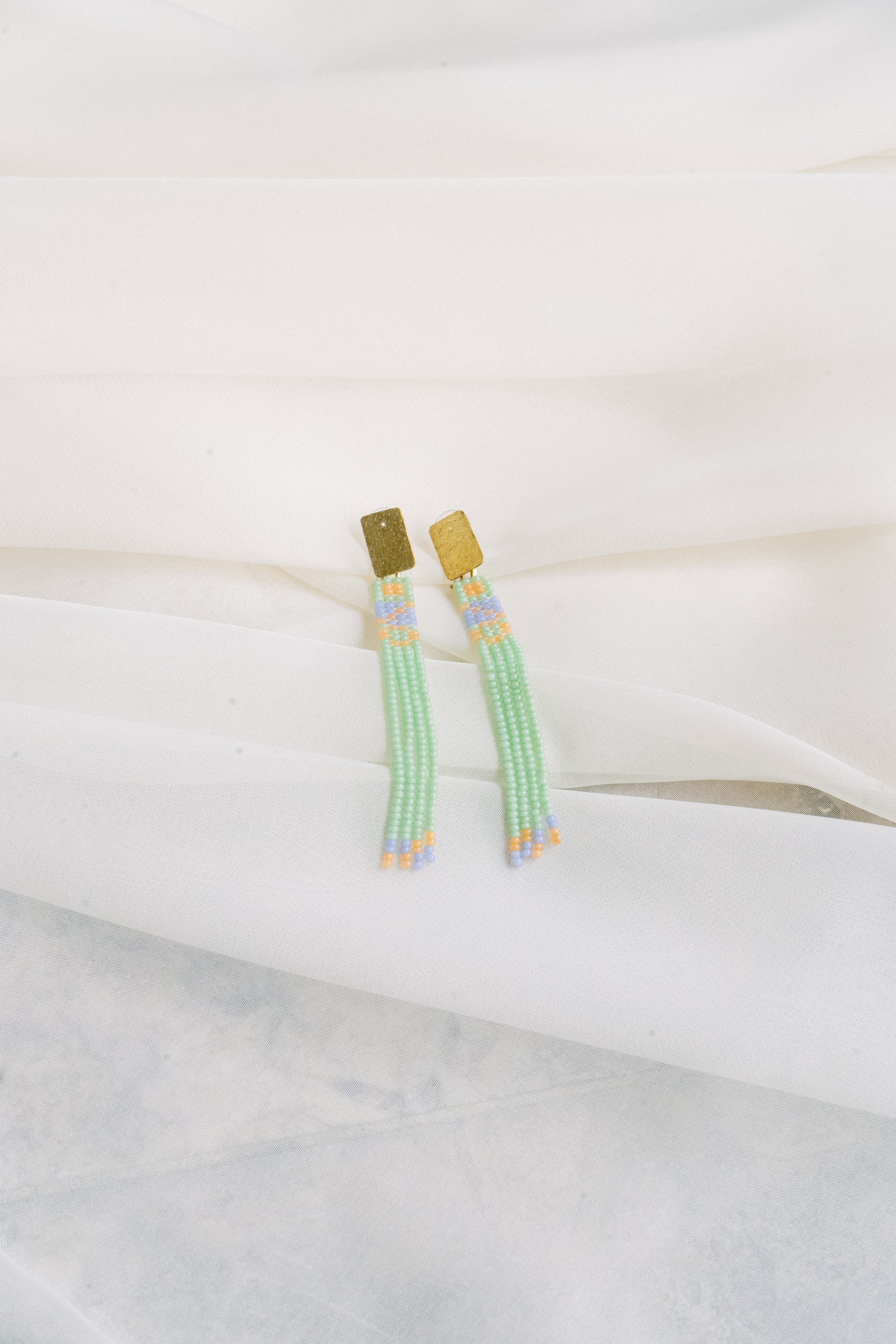 Están tejidos a mano utilizando micro cuentas de vidrio e hilo de poliéster, lo que les aporta resistencia y durabilidad. Su base de latón está realizada por artesanos especializados en joyería.