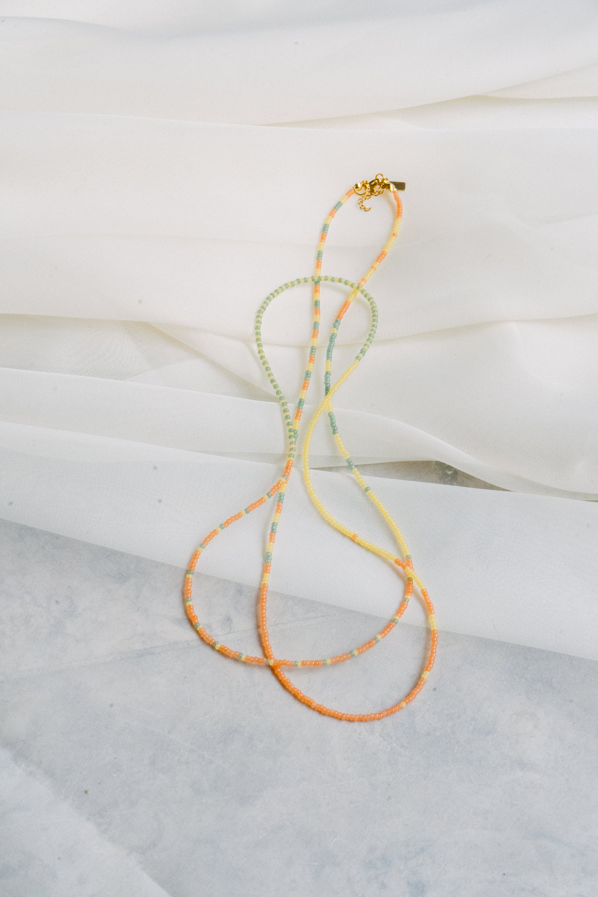 Están tejidos a mano utilizando micro cuentas de vidrio e hilo de poliéster, lo que les aporta resistencia y durabilidad. Posee un cierre ajustable de acero antialérgico para adaptarse a todos los tamaños de cuello.